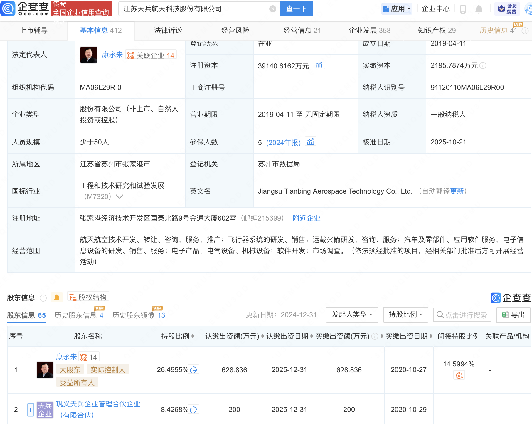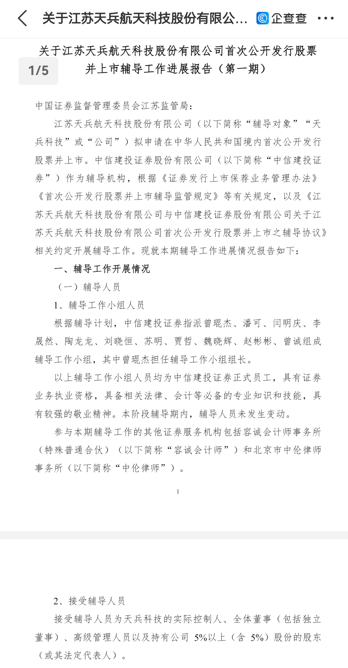 近日,江苏天兵航天科技股份有限公司公示IPO上市辅导进展报告(第一期),中信建投(601066)作为辅导机构,参与本期辅导工作的其他证券服务机构包括容诚会计师事务所(特殊普通合伙)和北京市中伦律师事务所,接受辅导人员为天兵科技的实际控制人、全体董事(包括独立董事)、高级管理人员以及持有公司5%以上(含5%)股份的股东(或其法定代表人)。企查查信息显示,该公司成立于2019年,法定代表人为康永来,经营范围包含:航天航空技术开发、转让、咨询、服务、推广;运载火箭研发、咨询、服务等,由康永来持股26.5%。