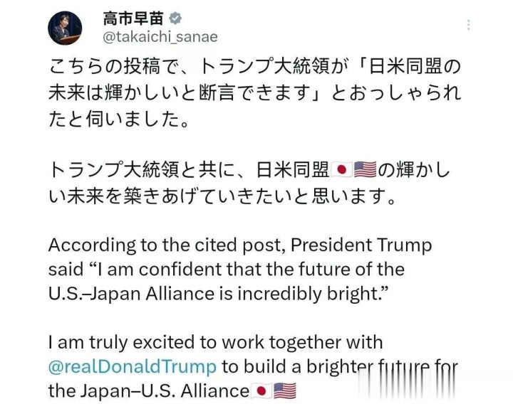 明知是来吸血的,但是高市早苗依旧难掩兴奋,送走了美防长之后,在社交平台上发文喊话特朗普:她坚信,美日同盟的未来前景无限光明。她由衷期待与特朗普总统携手,共创美日同盟的美好未来。