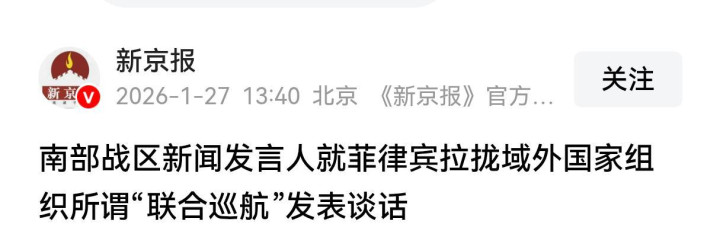 “南部战区新闻发言人就菲律宾拉拢域外国家组织所谓联合巡航发表谈话”—新京报2026年1月27号