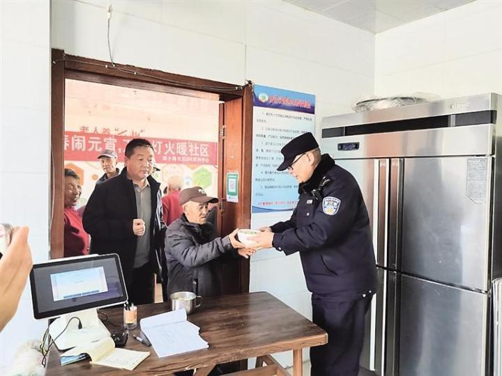 不再是“坐堂办公”的严肃,也没有隔着办公桌的距离,民警、辅警端着饭碗,和村民们一起围坐在桌旁,促膝长谈。
