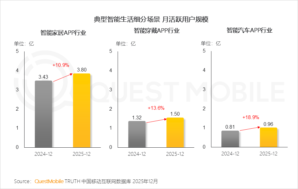 受AI技术迭代影响,智能应用“泛化”的趋势已经非常明显。尤其是AI与智能硬件结合给用户带来升级体验,让诸多智能场景下的用户流量出现了显著提升。QuestMobile数据显示,智能家居、智能穿戴、智能汽车App行业月活跃用户规模分别达到3.8亿、1.5亿和9600万,同比增长率分别为10.9%、13.6%和18.9%。可以预见,在AI技术的普及和驱动下,面向更广泛应用场景中的“超级入口”争夺,显然将演变为“AI入口”大战之后的下一个战场。