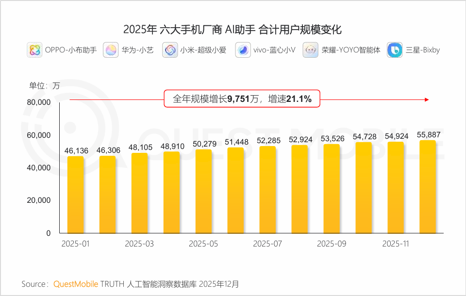 而与此前入口厮杀中手机厂商一直处于“弱势”方不同,这场AI“入口级”争夺战中,手机厂商早已经提前布局,并且凭借系统级优势,成为关键玩家之一。QuestMobile数据显示,2025年6大手机厂商旗下AI助手合计增长9751万,增速达21.1%。