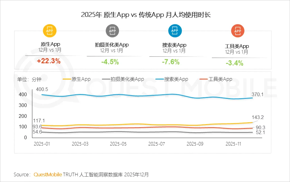 同时,更为重要的趋势已经出现:AI原生App吞噬传统垂直类应用App的用户时长,从2025年的变化上看,相比1月,12月AI原生App用户时长增长了22.3%,拍摄类App、搜索类App、工具类App则分别下降了4.5%、7.6%、3.4%。